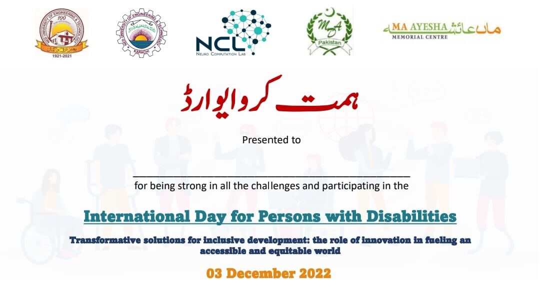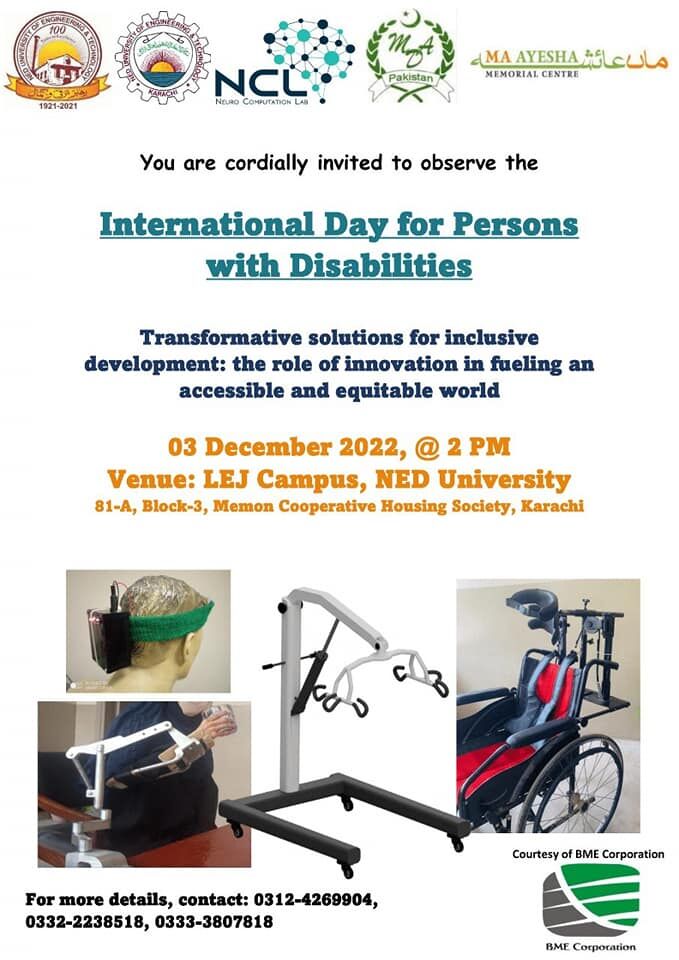 LinkThe Department of Biomedical Engineering and the Neurocomputation Lab (NCL - NED), NED University observed the "International Day for Persons with Disabilities" at the LEJ Campus on 3rd December 2022. Around 286 participants attended the event. The differently-abled persons such as those having muscular dystrophy, blindness, neurological disorders, psychological disorders, and drug addiction were present. Moreover, the caregivers and doctors as well as government officials attended and appreciated the event. The differently-abled persons showed their talent while the guest speakers highlighted the medical and technological aspects of rehabilitation in addition to the initiatives at personal, community, and governmental levels. The unique aspect of this celebration was the exhibition of locally developed assistive and diagnostic devices. Event participants experienced first-hand demonstrations and tested these technologies developed at NED University. We thank the organizers of this wonderful event including the faculty members of Biomedical Engineering, Neurocomputation Lab, Muscular Dystrophy Association Pakistan, Ma Ayesha Memorial Center, BME Corporation, and last but not least the very energetic volunteers who made this event successful and played their role to spread smiles and hope among the participants.